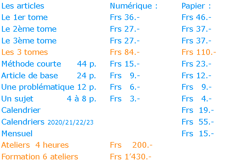Pour achat sans code calculez votre montant et ajoutez les frais de port : Frs 4.– par livre, calendrier, mensuel / Frs 10.– pour le guide complet / Frs 1.– pour 1 ou 2 articles Et Frs 3.- si payement au guichet. Merci d’envoyer un mail avec votre nom, adresse et la description de la commande à : info@cadodelavie.ch Elle vous sera envoyée dès le payement reçu |